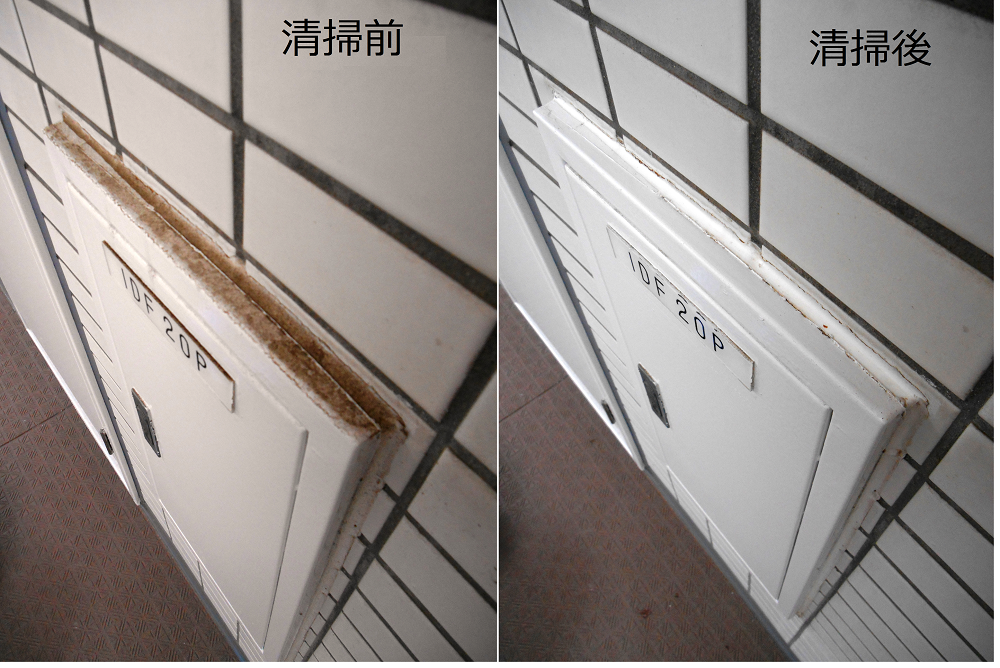 次にパイプシャフト(メータボックス)の扉上部の汚れですが、ここは扉を開けて拭き掃除をするように指導を行っています。