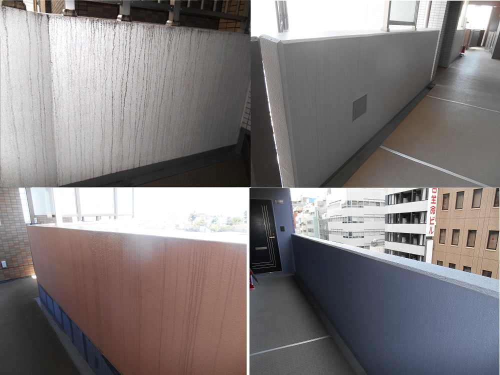 マンション開放型廊下腰壁の写真です。4つのマンションで右側と左側では壁の汚れに大きな違いがあります。