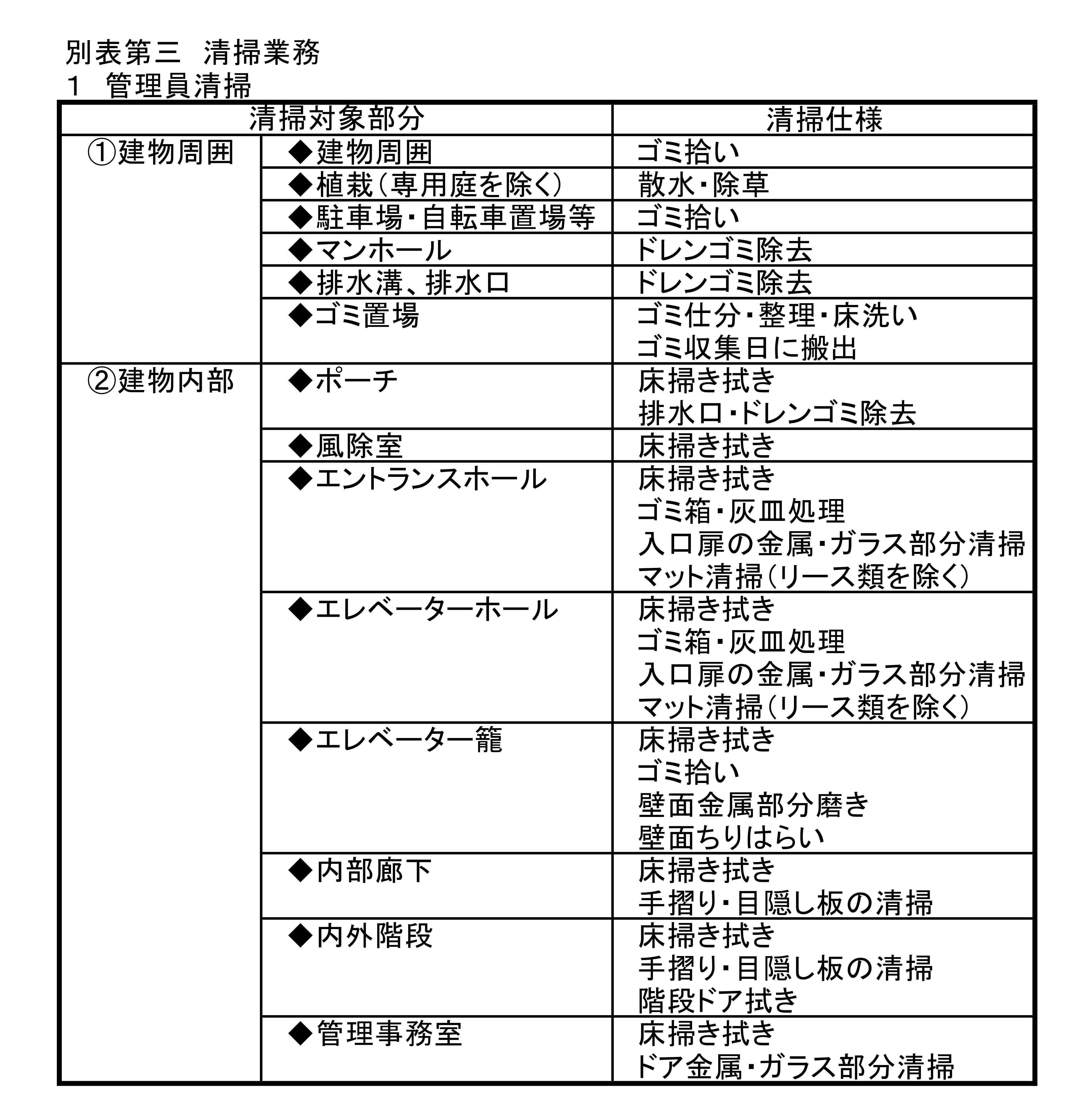 管理員清掃(日常清掃)については、清掃対象部分と清掃仕様が書かれています。