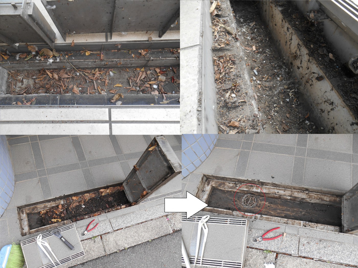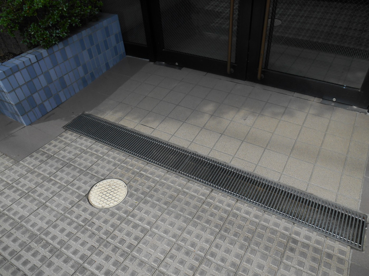 マンションエントランスへの雨の浸入を防ぐ為に溝が設置されています。他にも駐車場・駐輪場・ごみ置き場などに同じように溝がありますが、溝の中に落ち葉や泥などが溜っていませんか?