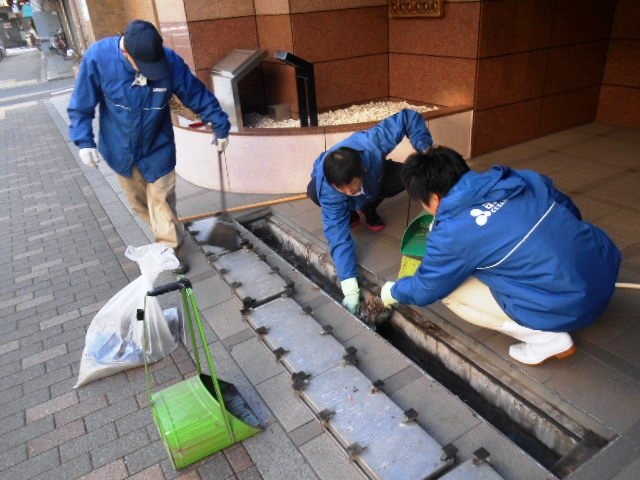 (社員管理員体験による雨水排水溝清掃)