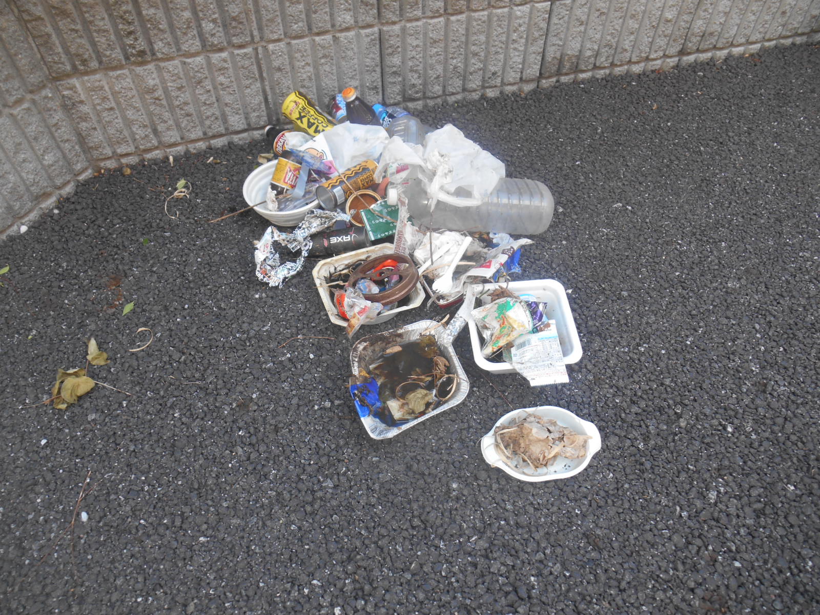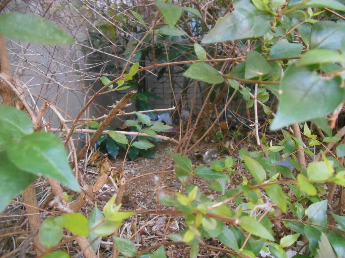 (植え込みの奥にごみが投げ込まれていました。)