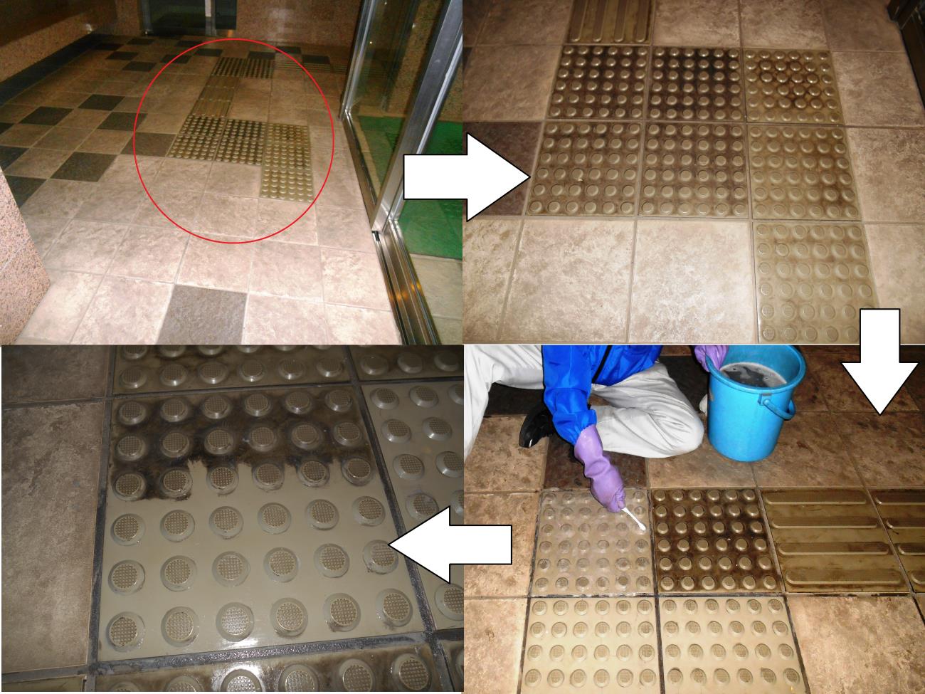 このマンションは年3回、定期清掃を行っていますが、この汚れはポリッシャ-(床などを洗い磨く清掃機械)でも落とせません。点字ブロックの凸凹に汚れが、溜まっているからです。