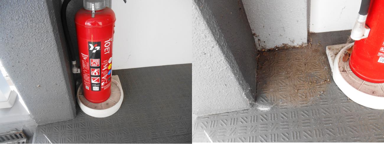 写真のマンションは新しく管理が開始したマンションで初日、状況確認の為に代行に入りました。今までは週に2回清掃業者が入っていたと聞いていましたが、消火器の汚れが気になり、ずらしてみたら写真右の状態でした。わたしたちは、清掃研修で消火器は移動して清掃するよう指導を行っています。