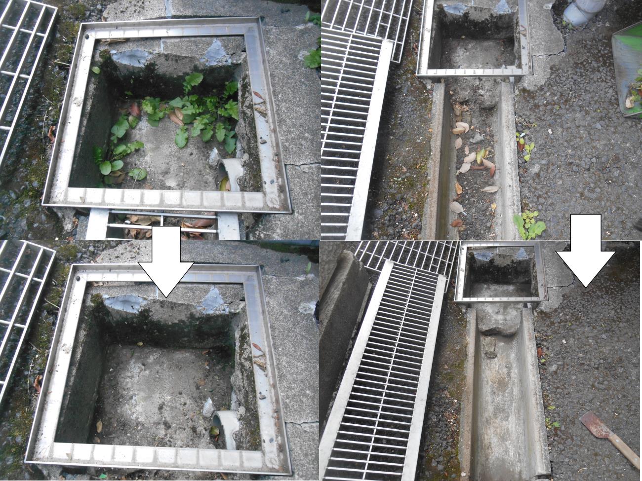 駐輪場前の雨水排水側溝ですが、枡の中に雑草が生えていますし、側溝部分も土汚れが溜まっていました。