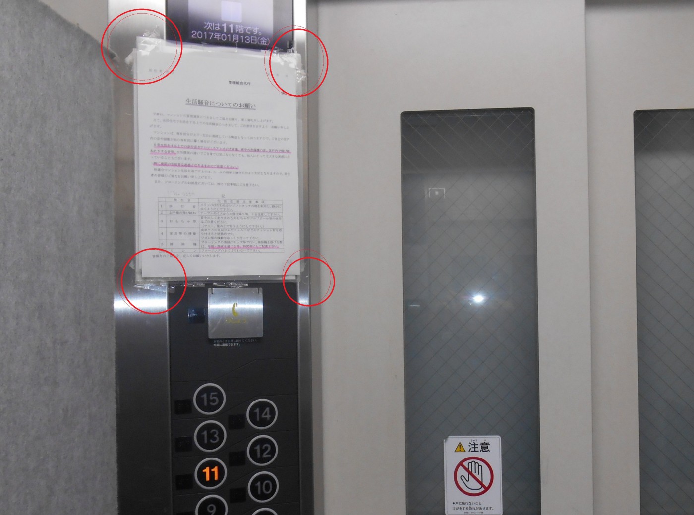 それでもエレベーター周りに掲示する場合は、掲示物をラミネートして両面テープで貼るようにします。