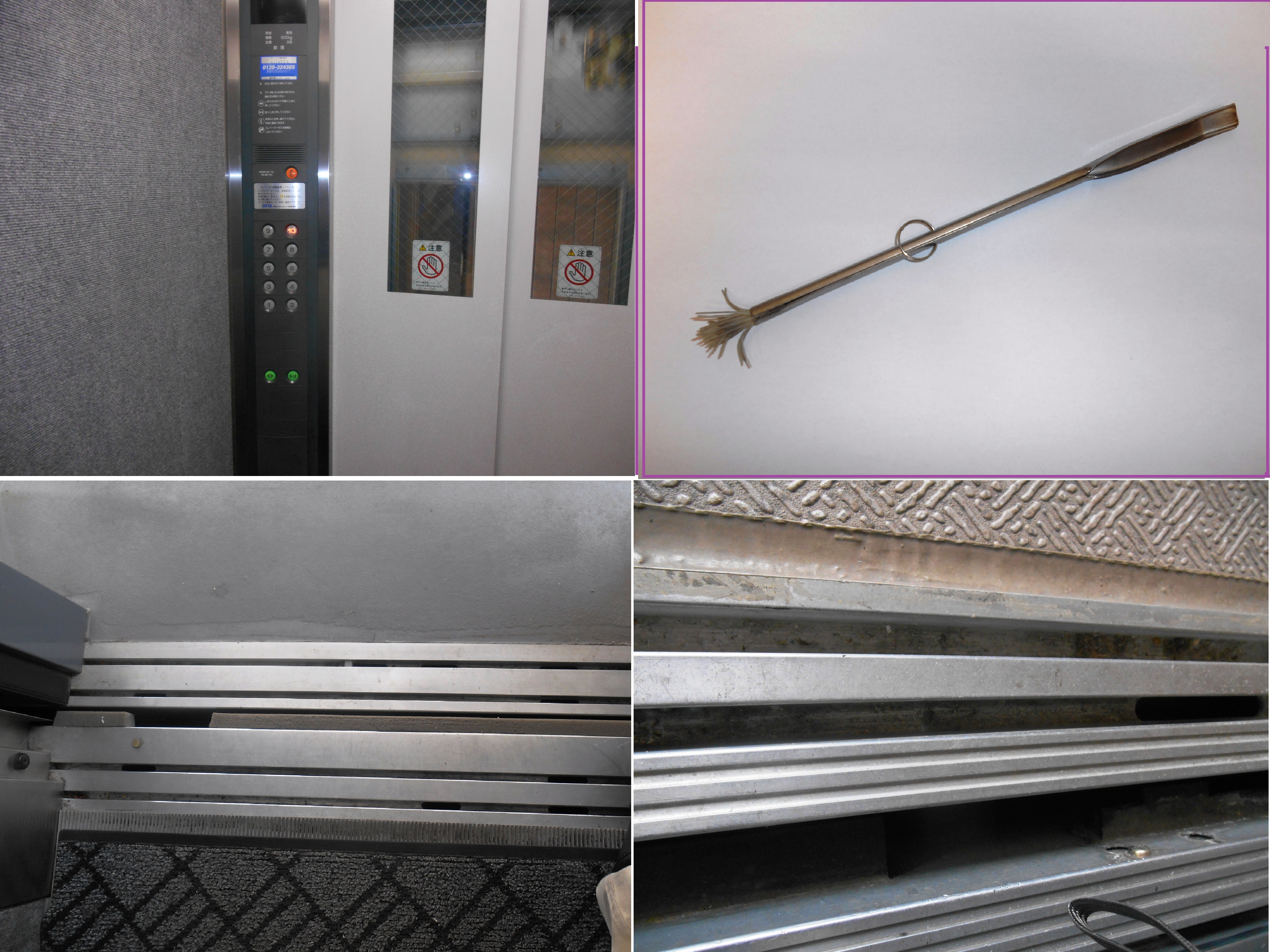 右上の写真はエレベーター溝専用の清掃道具です。エレベーターのメンテナンス会社に言えばもらえます。