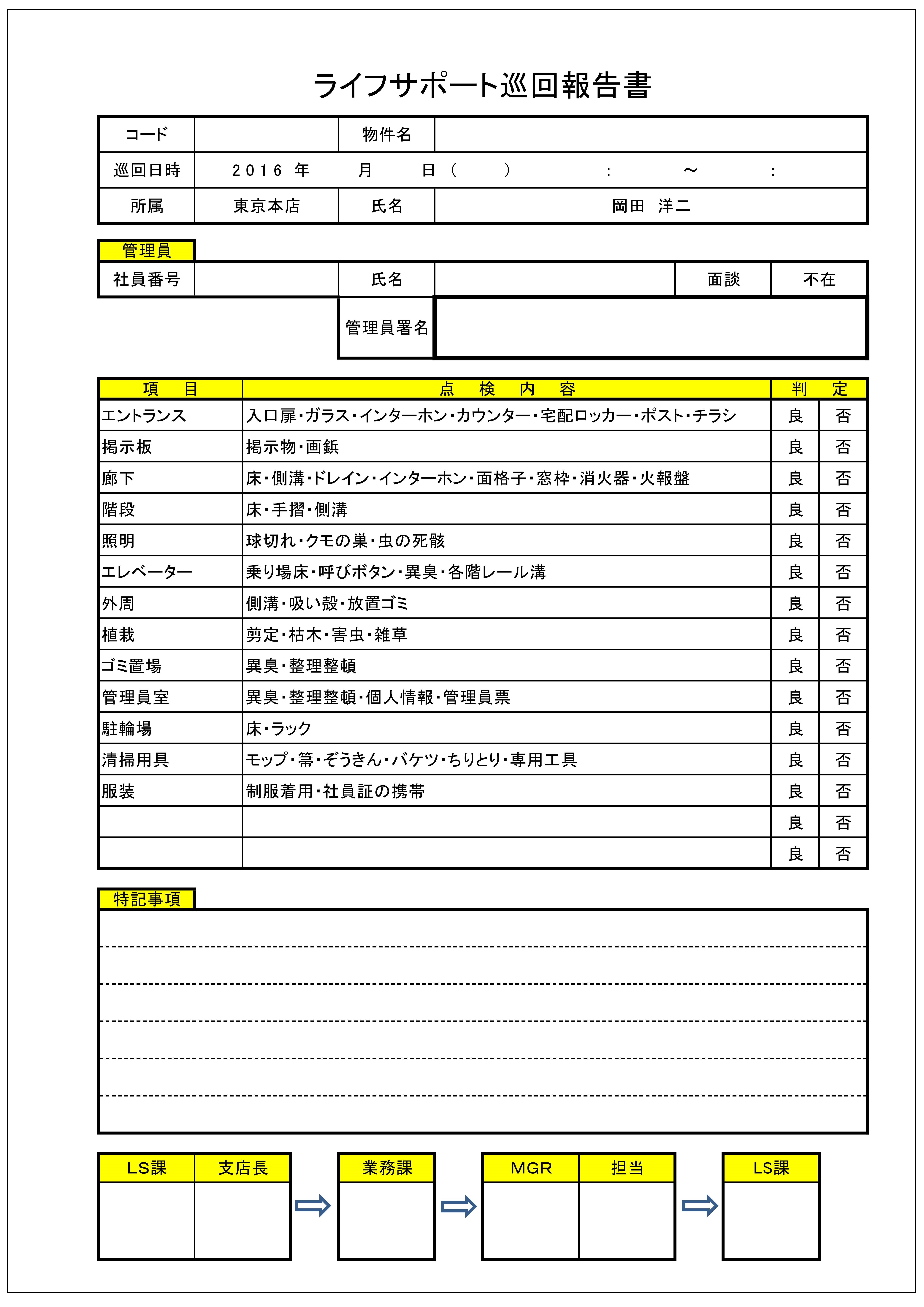マンションの巡回の際に持っていく『巡回報告書』ですが、項目ごとに【良】・【否】で判定して、最後に管理員さんから署名をもらうようになっています。LS巡回報告書(岡田用)