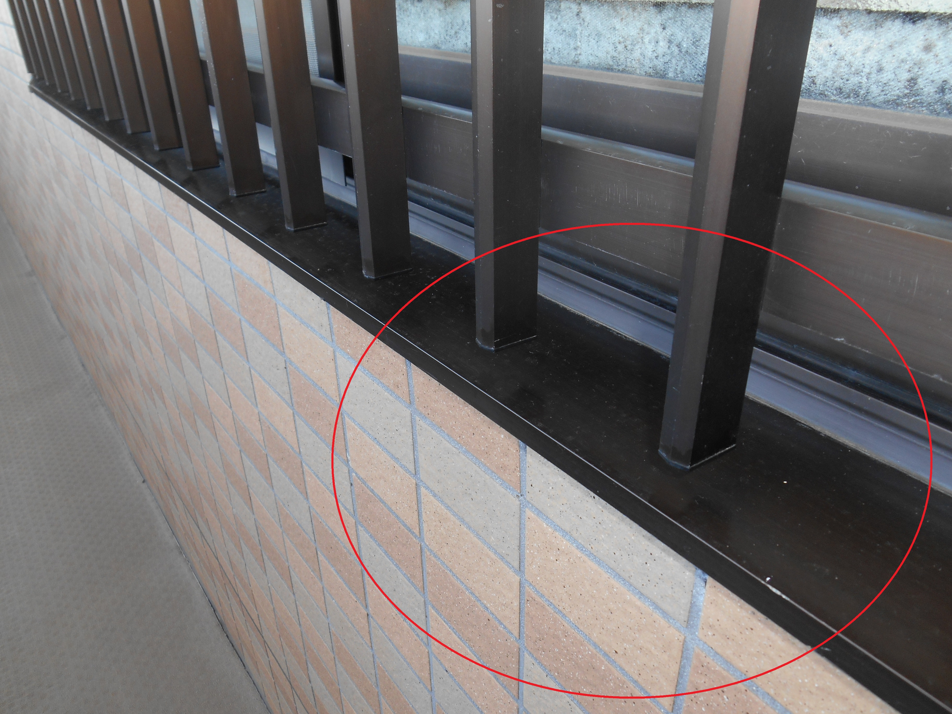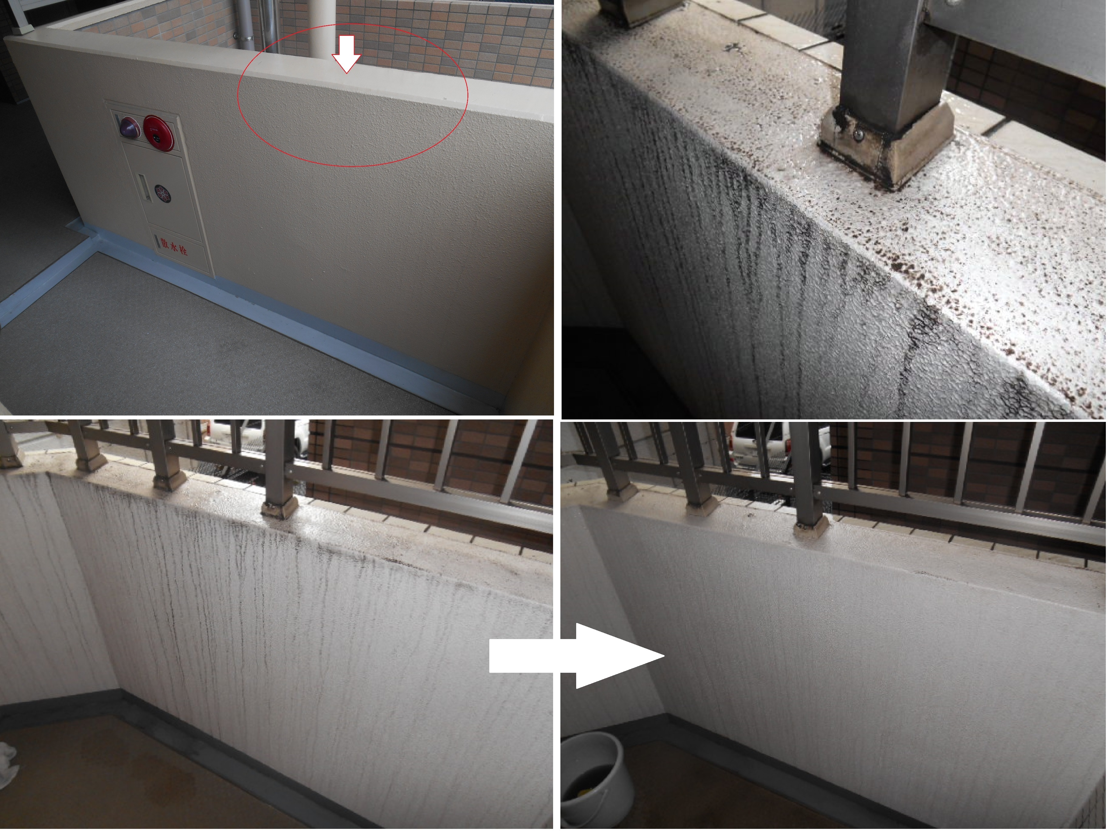 この部分の清掃がきちんとされていないと、写真のように雨が降った際に天端の汚れが腰壁に流れ落ち、年数が経つと落とせなくなってしまいます。