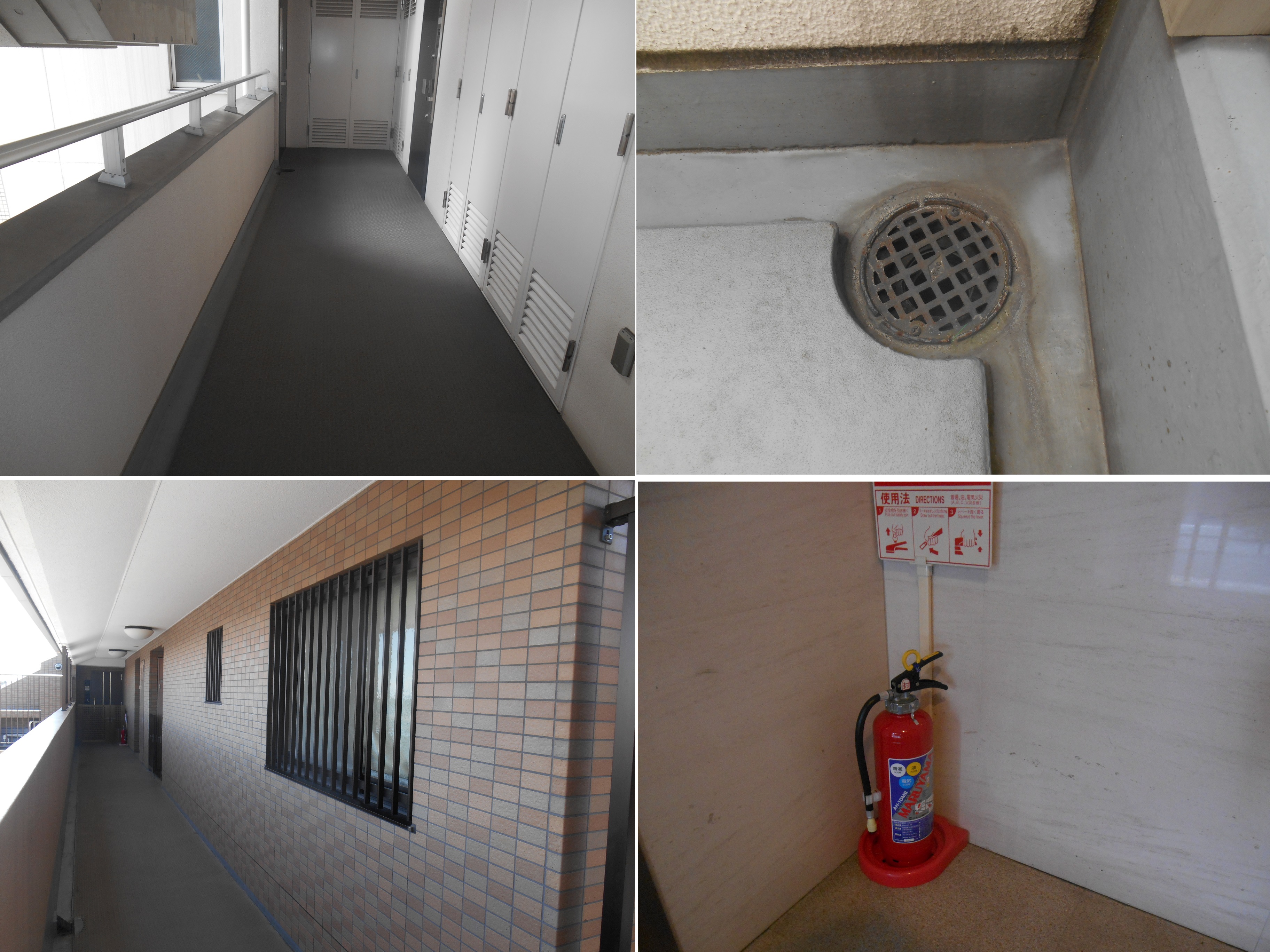 ③廊下(床・側溝ドレイン・インターホン・面格子・窓枠・消火器・火報盤)