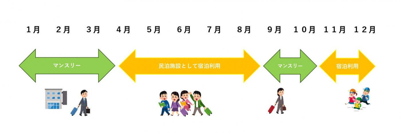 実際こちらの施設は、9月や年末、3月は転勤や長期出張でのマンスリー利用として、夏休みやその他の期間は宿泊施設として稼働しています。