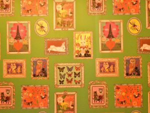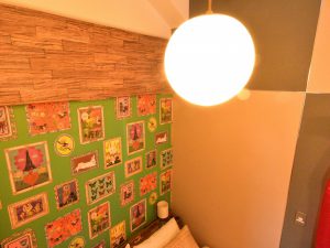 大胆なグリーンのアクセントクロスに張替えをしました。よく見るといろんな動物が隠れているんですよ~窓の周りはピンク×グレーのチェック模様に。