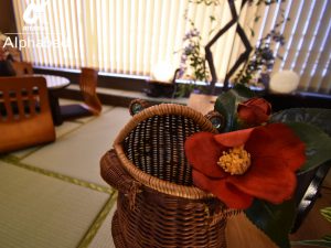 畳に合わせてクロスの色も替え、和風テイストのテーブルや小物を設置。