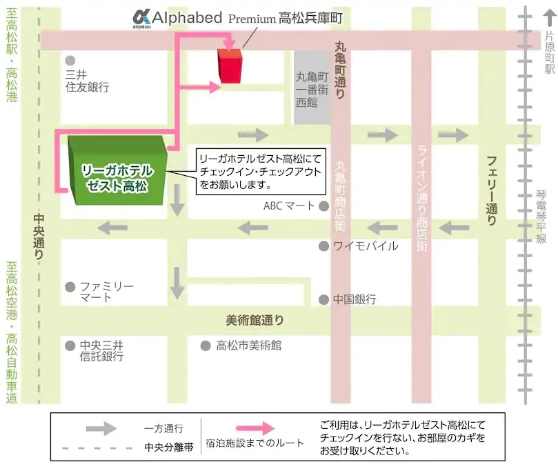 チェックイン・アウトは、リーガホテルゼスト高松にて行います。施設までは徒歩2分程、歩いてすぐの場所です。チェックイン前、アウト後の荷物預かりも可能です。