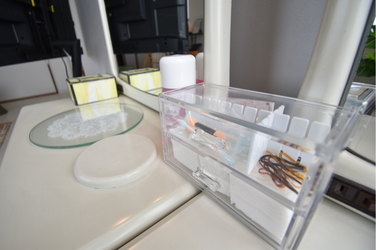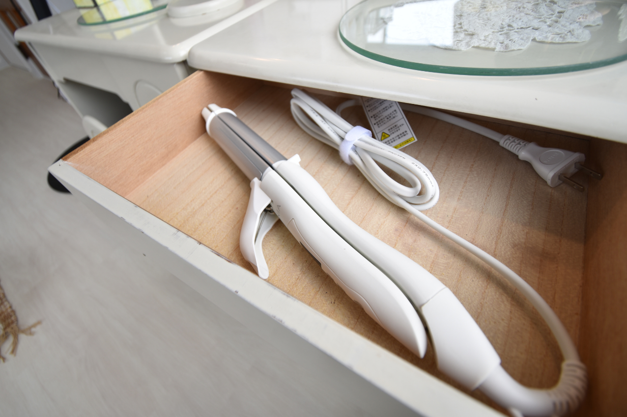 ヘアアイロンやブラシ、個別のアメニティ、綿棒、ヘアゴム、コットンなど細かいところまでそろっています。