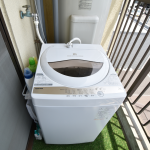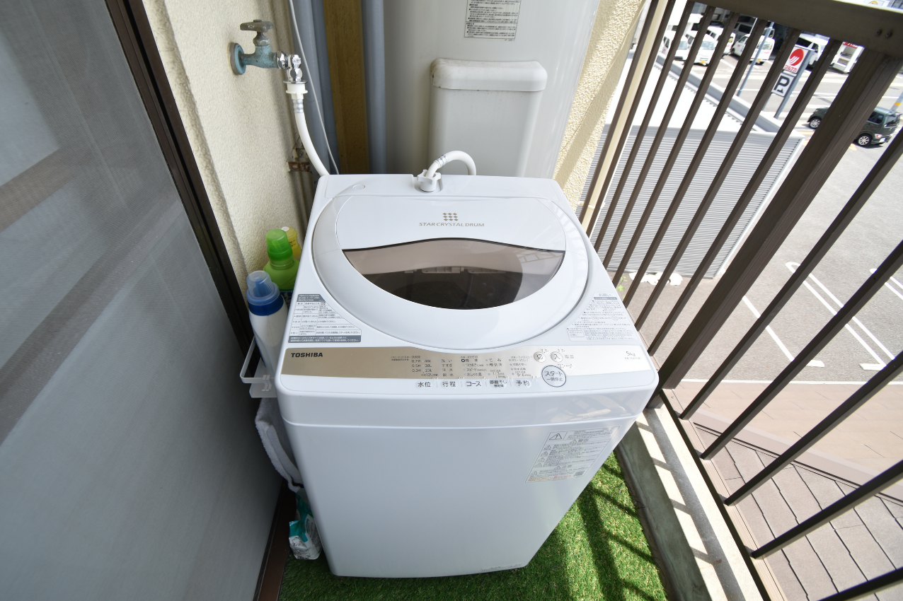 ◆洗濯機と物干し、洗濯洗剤を完備。バルコニーに設置しています。