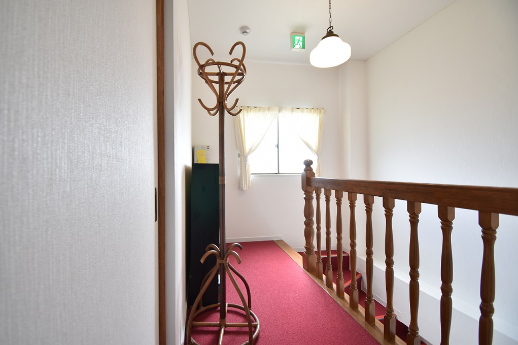写真映えしそうな階段と赤絨毯!かわいい洋服掛けもラタンがむしろ今風でキュンとします。