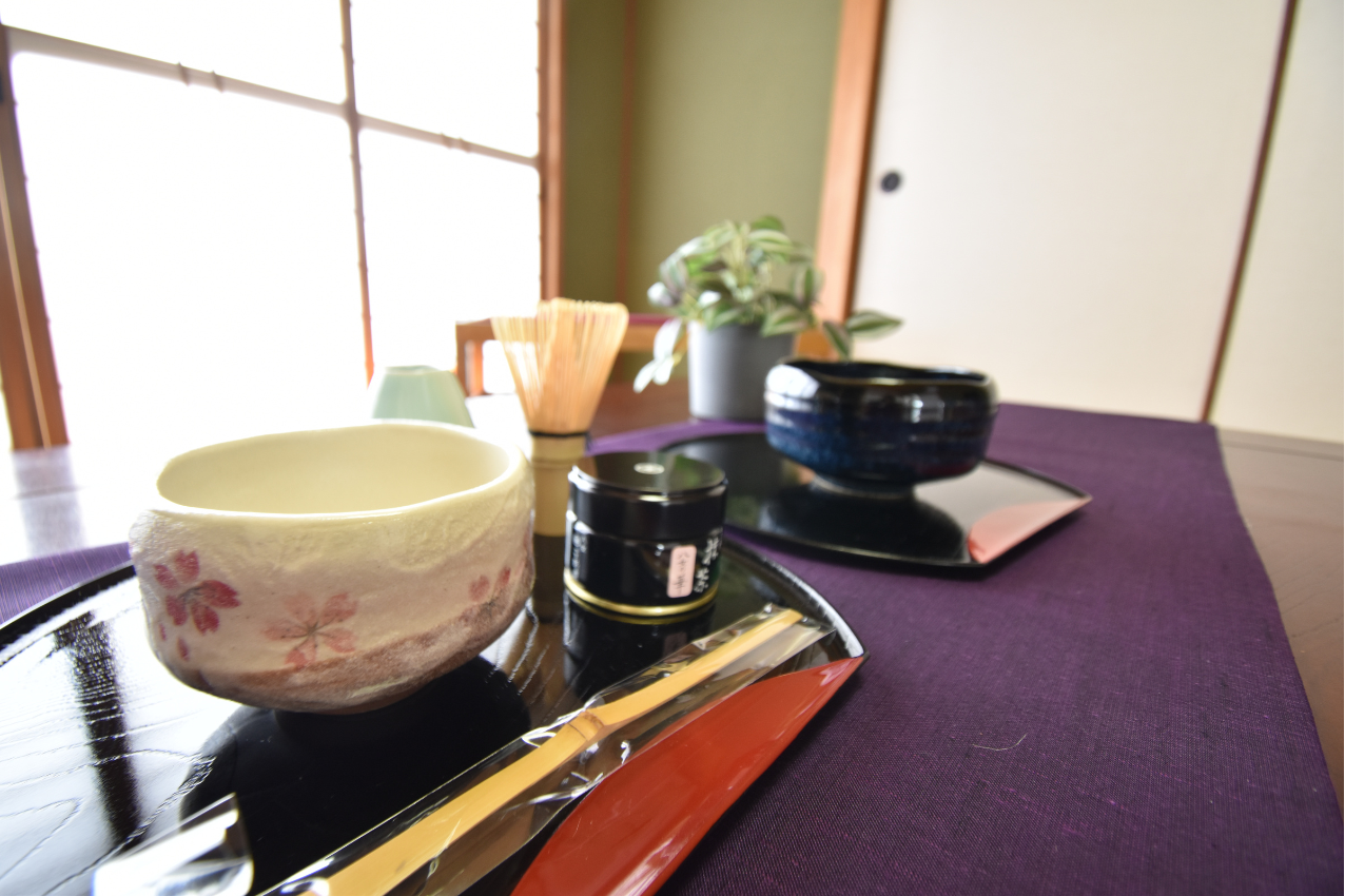 また、ウェルカムドリンクとしてお抹茶をご用意しております!お茶道具をそろえていますので、お茶をたててみてください。
