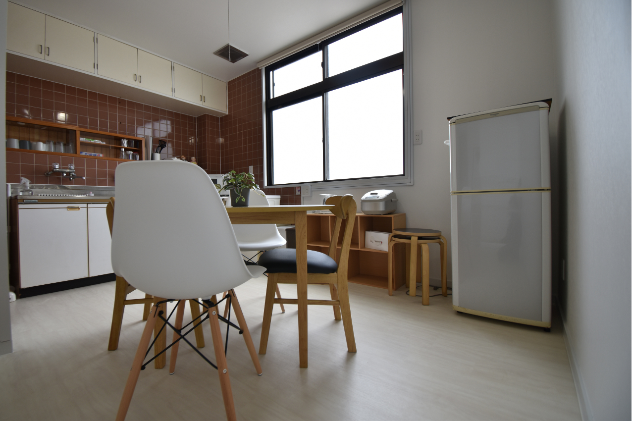 ◆キッチンに包丁や鍋、フライパン等の簡単な調理器具、食器類をご用意。また、2ドア冷蔵庫、電気ケトル、電子レンジといった家電も設置。