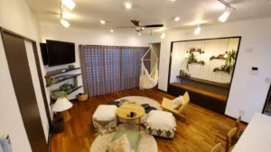 そして、そのすぐ後ろにあるリビングには、テレビとクッションが並んだゆったりくつろぎのスペースが続いております。