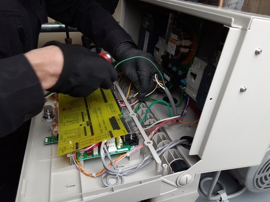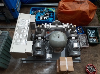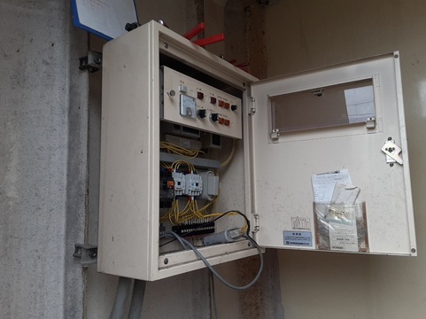 まず揚水ポンプの制御盤についている配線を加圧給水ポンプに使用するため、外して・・・