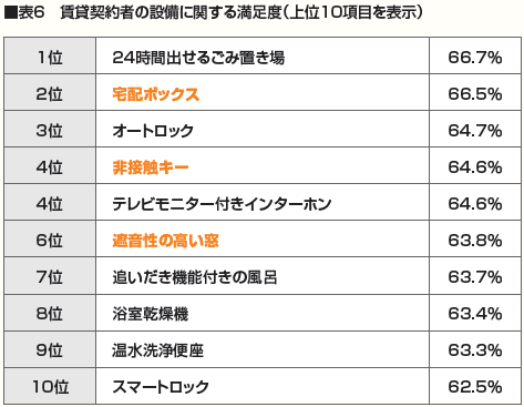 賃貸借契約者の設備に関する満足度調査、上位10位の項目です。