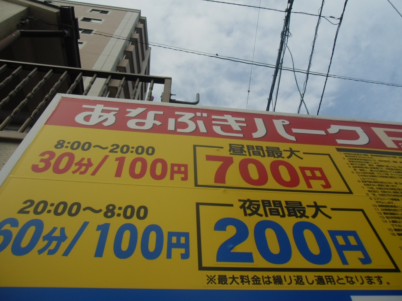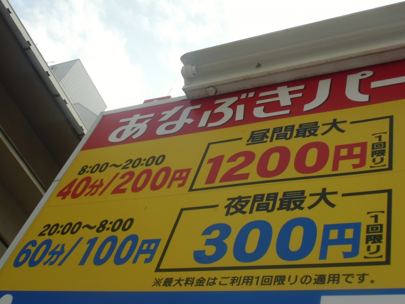 最大料金が無い場合の利用料金の考え方は、看板記載の30分/200円(8:00~24:00)60分/100円(24:00~8:00)の料金が繰り返し適用されますので、比較的高額な利用料金となることが言えます。