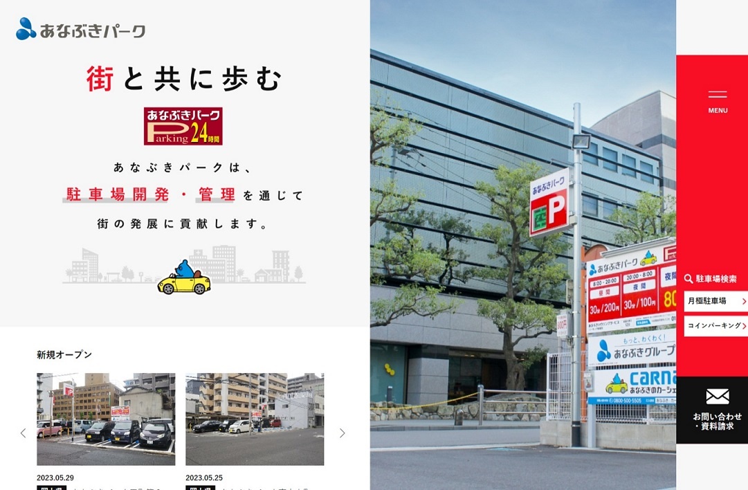弊社コインパーキングは【あなぶきパーク】とインターネット検索していただくと、トップページより物件住所や地図を確認できるようになっておりますので、下記の画面からぜひご確認下さい。