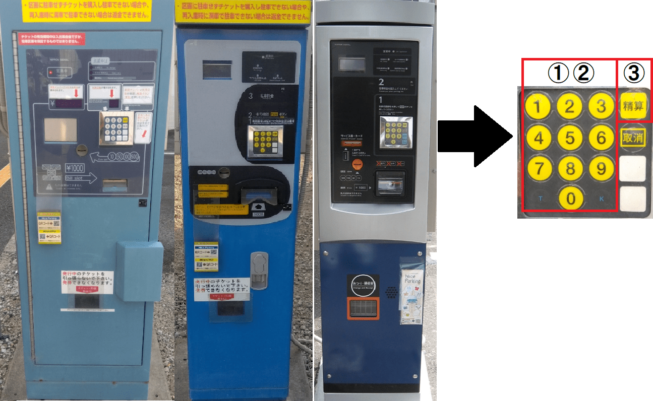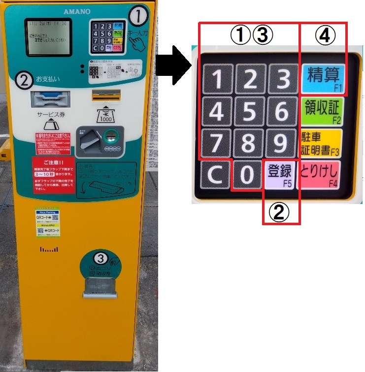 数字が入っているディスプレイは気にせず、車両番号→駐車区分(駐車日数)を入力してください。
