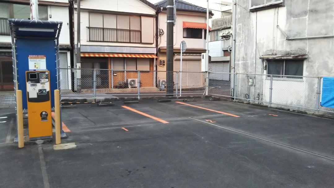 写真の通り、先程のフラップ式とは異なり、車室にフラップ板が設置されていません。都心部を始め、近年では地方でもこのようなフラップレス式コインパーキングは増加傾向にあります。利用方法はフラップ式とほぼ同じです。フラップ式コインパーキングと同様に、アスファルト内に埋め込まれてあるセンサーが車両を検知して料金を加算します。センサー埋込方法の他にも、車室の後ろにセンサーポールが設置されているタイプもあり、いずれもフラップ式と異なり、車室に機械が設置されていない為、車両の入出庫がスムーズにでき、機械トラブルや事故のリスクを軽減します。
