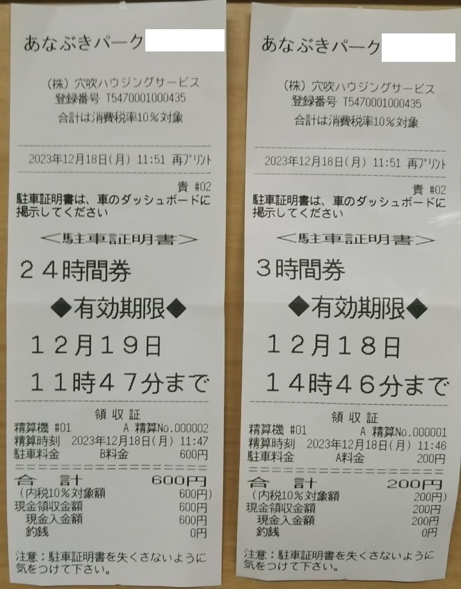 上記写真は実際に購入したチケット(駐車証明書)の写真です。この駐車場では「3時間券」と「24時間券」の2種類のチケットの購入が可能です。このチケットを外部から見えるようにダッシュボード上に置く事で駐車場の利用が可能となります。写真の通り「〇月〇日〇時まで」と、チケットの有効期限が表示されています。