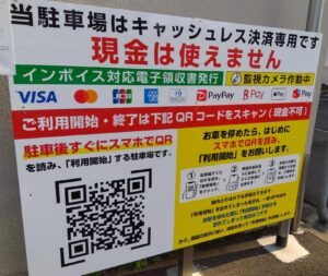 これまでのコインパーキングとは違い精算機も無ければフラップもありません。お客様が入庫した際にQRコードを読み取り利用開始の手続き、そして出庫される際は再度QRコードを読み取り利用された料金をスマートフォンで支払う事で決済終了。雨の日など濡れながら精算機の前でお財布を取り出しお金を払う行為をしなくても車の中からスマートフォンでQRコードを読み取り操作をして決済完了できるなど、これまでのコインパーキングとの違いを見せております。ただし注意する事があります。精算機がない駐車場になりますので当然現金が使えません。これまでのコインパーキングと思って駐車してしまうと精算時に困ってしまう事になりますので駐車前によく看板をご覧になって駐車して下さい。