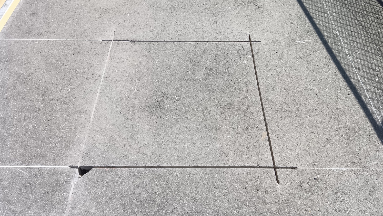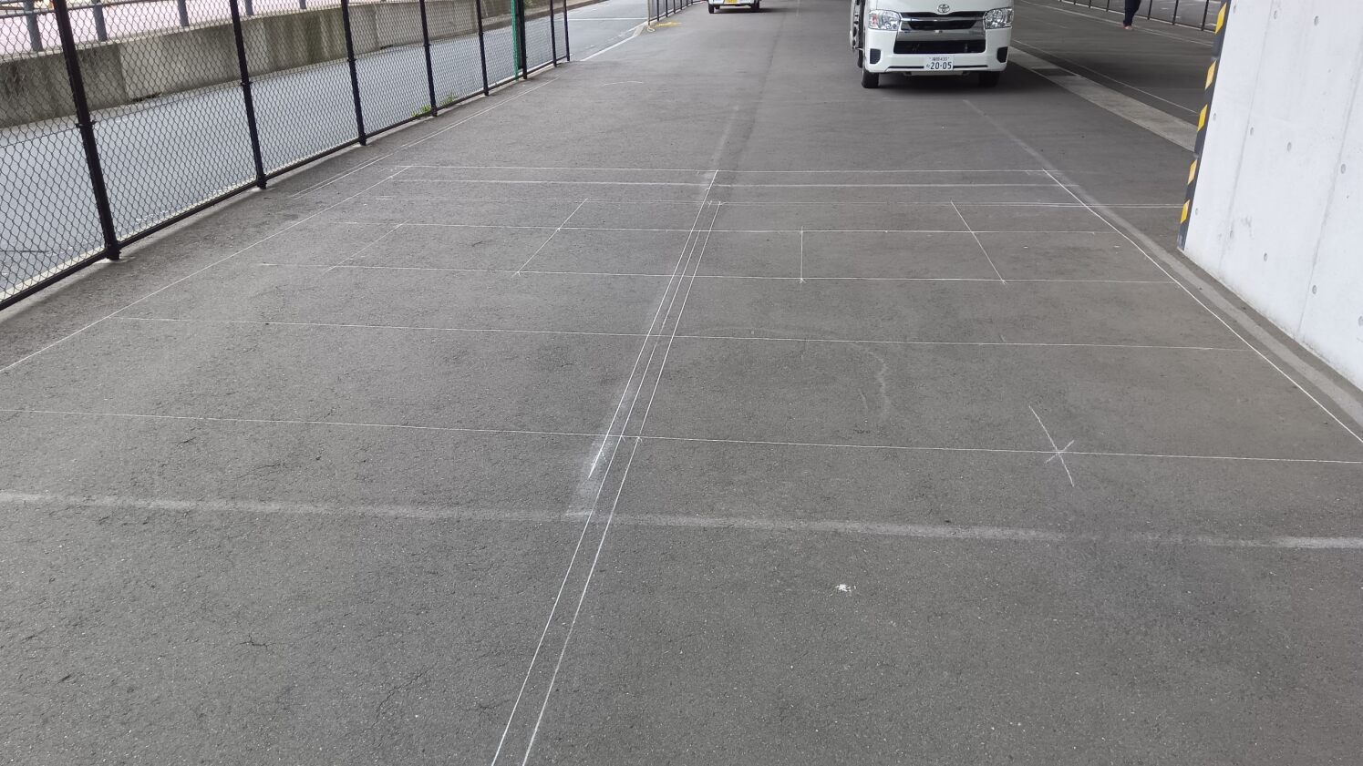 ・上記写真は、工事開始直後の「墨出し」と言われる、いわば下書きのようなものです。車室線を引くための準備、後述するカッター工事のための準備作業となります。