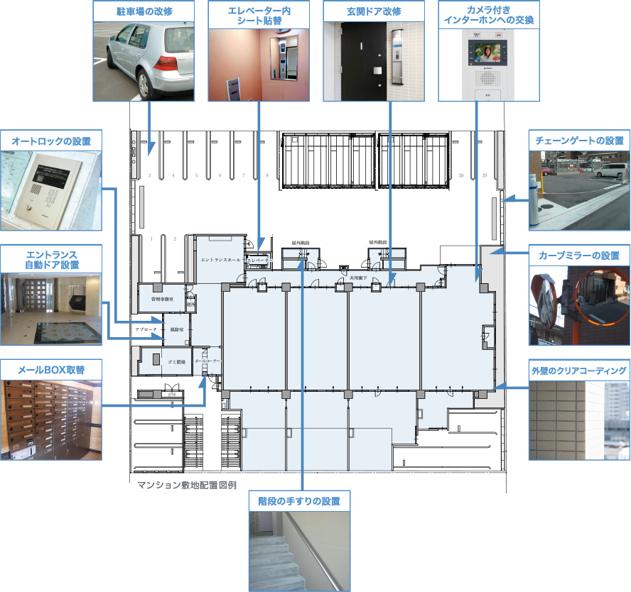 マンションの大規模修繕工事は建物本体の機能回復を主といたしておりますが、オプション工事として次のようなものがあります。