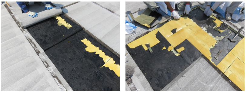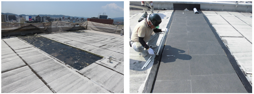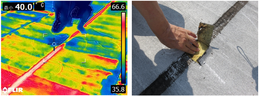 シートのジョイント部分付近で温度変化を確認し、ジョイント部分に不具合があると想定し、一部開口しました。断熱材に水分を含んでいることを確認し、漏水範囲の防水層を一部撤去し、再補修いたしました。