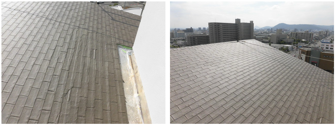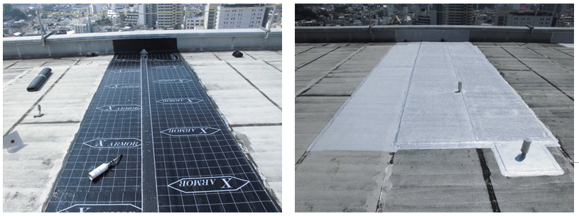 この不具合部分につきましては、水系の2成分反応形アクリルゴムを防水層とする、屋根塗膜防水工法により修繕工事を行いました。