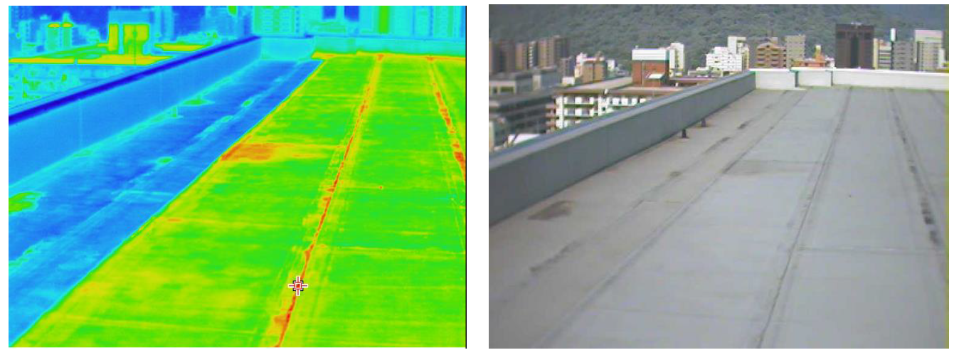 この事例2の調査につきましては、リビング天井より漏水があり、既存防水層の現状(防水層・断熱材・躯体表面での老衰の有無及び防水層の劣化等)を確認するために、赤外線サーモグラフィを用いて熱エネルギーを視覚化し、防水層内部の通水の有無を温度分布画像分析を実施いたしました。その結果、防水層の下に通水を確認することができました。