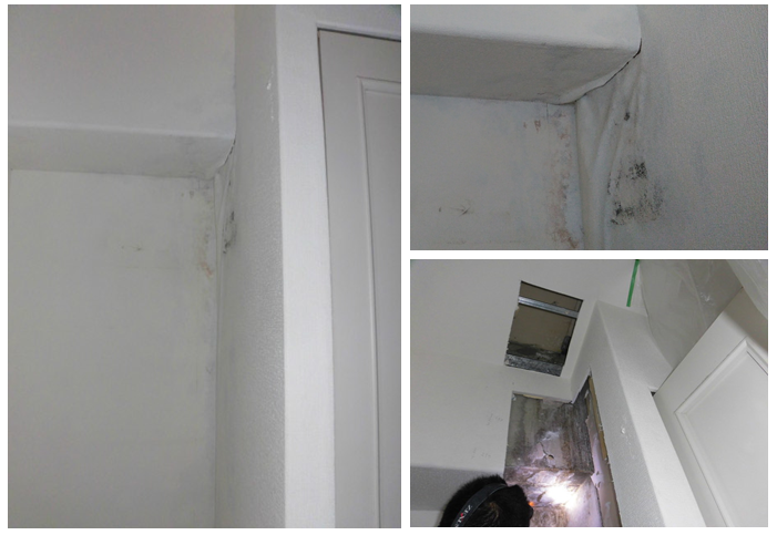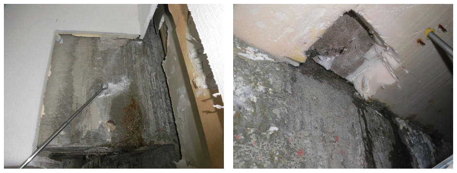 こちらの事例は、築年数30年超のマンションにおける漏水被害の事例となります。お部屋内の洋室の梁とクローゼットの壁に、壁紙の水濡れが確認され、ご入居者様からご連絡いただきました。天井-壁の一部のボード(壁部分)を開口して、どこから水が入ってきているのか、漏水箇所の確認を行いました。濡れている個所のボードを切開し、そこより水が流れてきている場所を確認し、ボード開口を行い、梁-天井から漏水しているのを確認しました。雨天時の折は、漏水により、たびたびお部屋内へ水が流入し、ご入居者さまは大変な思いをされていたとのことです。