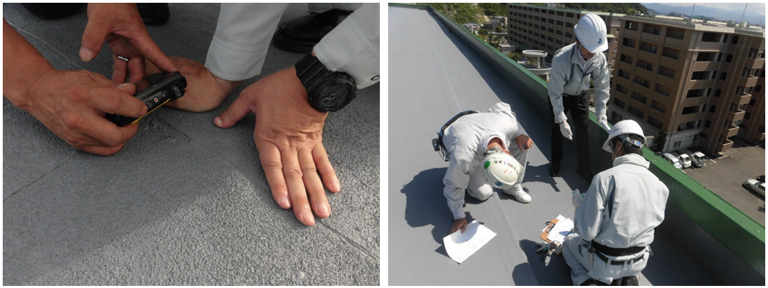 屋上の防水層に不具合がある場合は、まず、目視・触診にて、くまなく不具合箇所(雨水進入口)を調査いたします。目視では、不具合箇所をあたりをつけてみるような形となりますので、足で踏んだり、手で押したりしながら、不具合箇所を調査していきます。