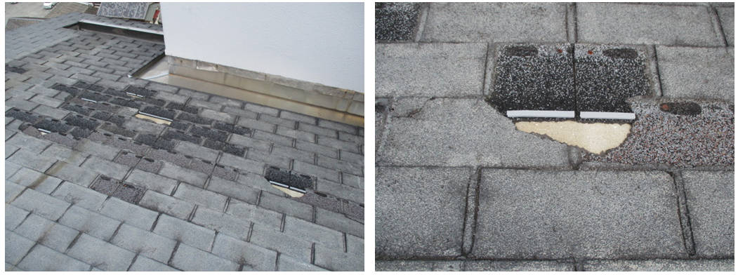 天井部分は屋上に該当する場所でしたので、付近の屋上の状態を確認しましたところ、屋上防水のアスファルトシングルが剥がれているのを確認することができました。
