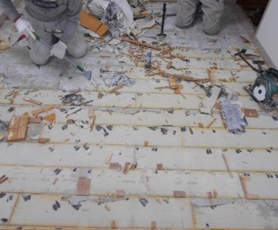 また、ここのフロアはコンクリート面が綺麗でしたので通常通りの作業が出来ましたが、建物や築年数等によって、フローリングを剥がすだけでは終わらない場合もあったり、クッションが経年劣化で、溶けてしまって、剥がせない場合もあります。