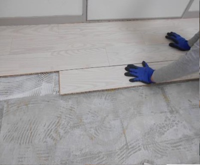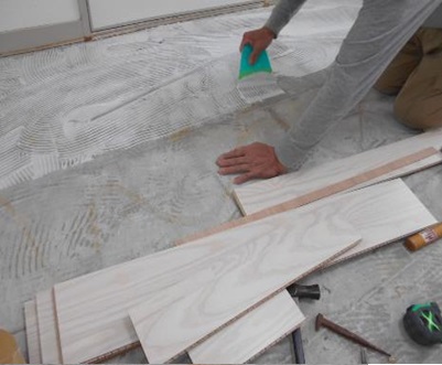 ボンドが乾いていない状態で乗ってしまうと、フローリングがずれてしますので注意が必要です。