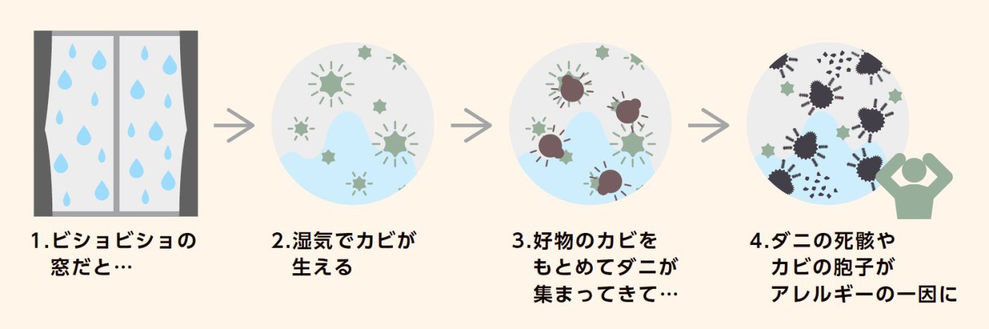 結露は放っておくとカビやダニが発生しアレルギーや喘息など、健康にも関わる問題です。