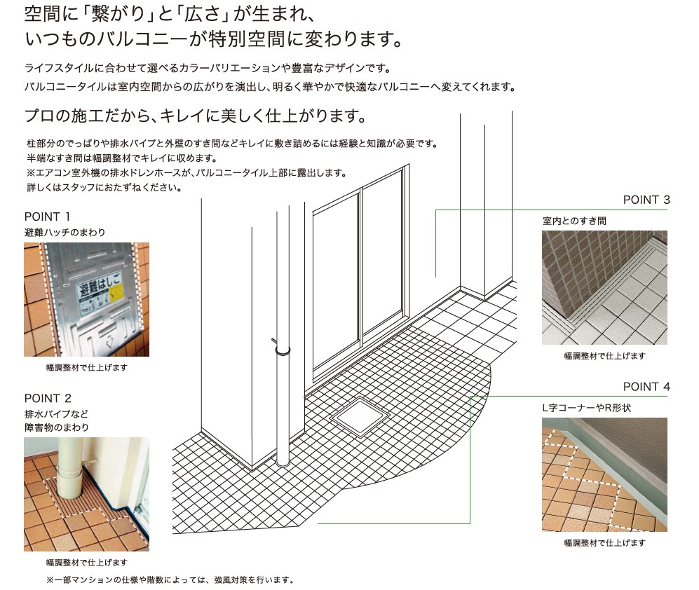 様々な種類のバルコニータイルがあり、お部屋雰囲気に合わせて選べます。