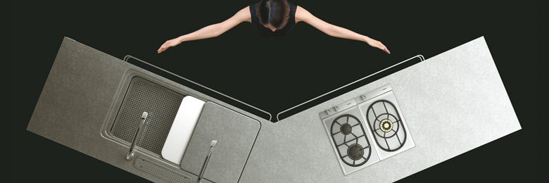 「V-LAND」は人が両手を開いた135°の角度。この自然な角度が、キッチンを囲む4方向の人との距離を近づけます。さらに、「人とキッチンの一体感」を極めたレイアウトは人間工学から生まれたもの。料理の効率化はもちろん、作業での手足の動きを少なくし、また首や眼の負担を軽減します。