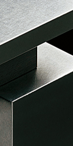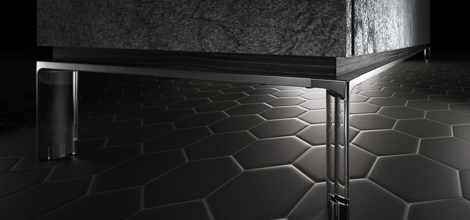 1本の脚で立つ印象的なT型ボディ。ワークトップの前後を斜めにカットし、さらに8ミリの繊細な面取り加工を施しました。見る角度でワークトップの薄さが強調され、ボディの鮮烈な光のラインが浮かび上がります。