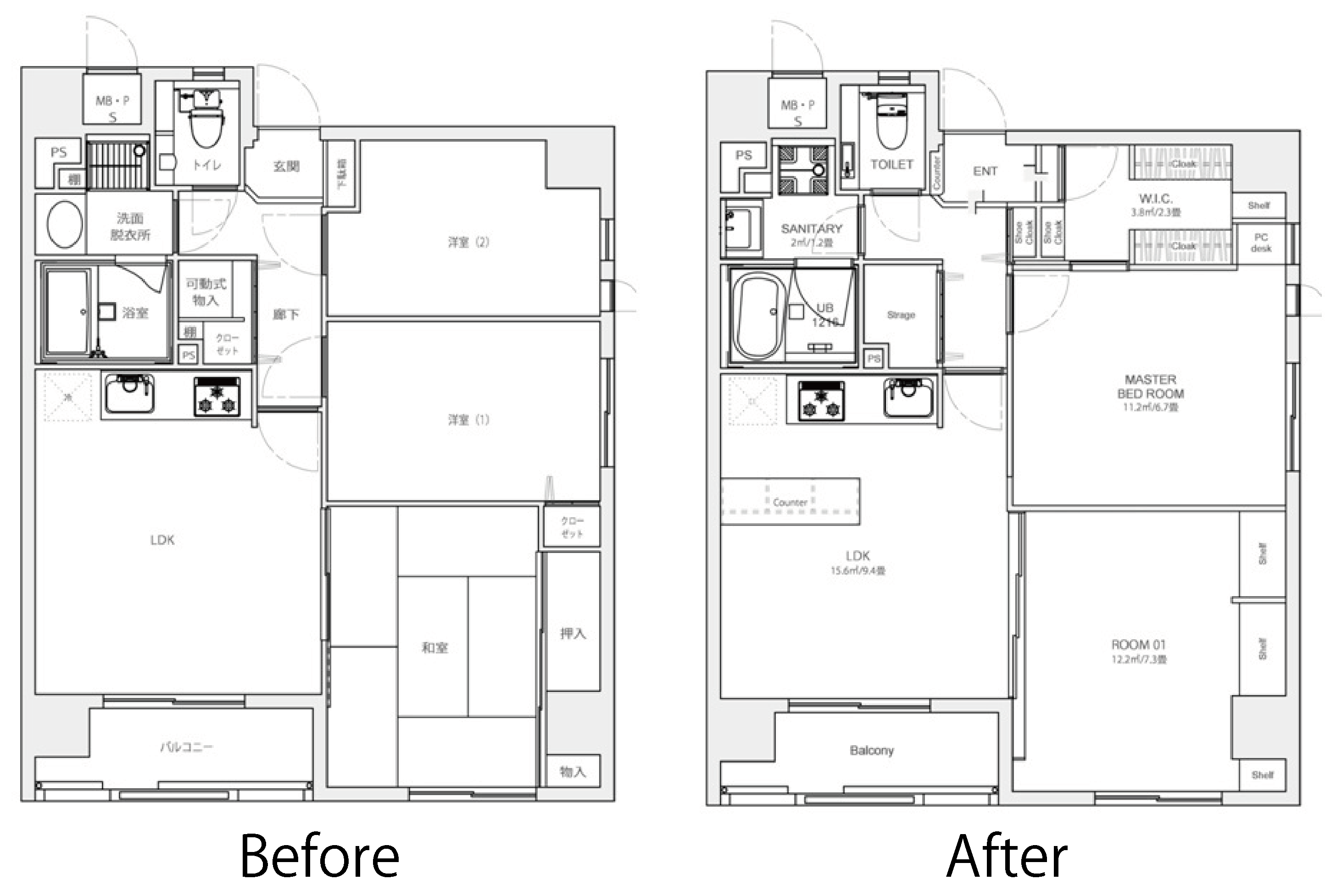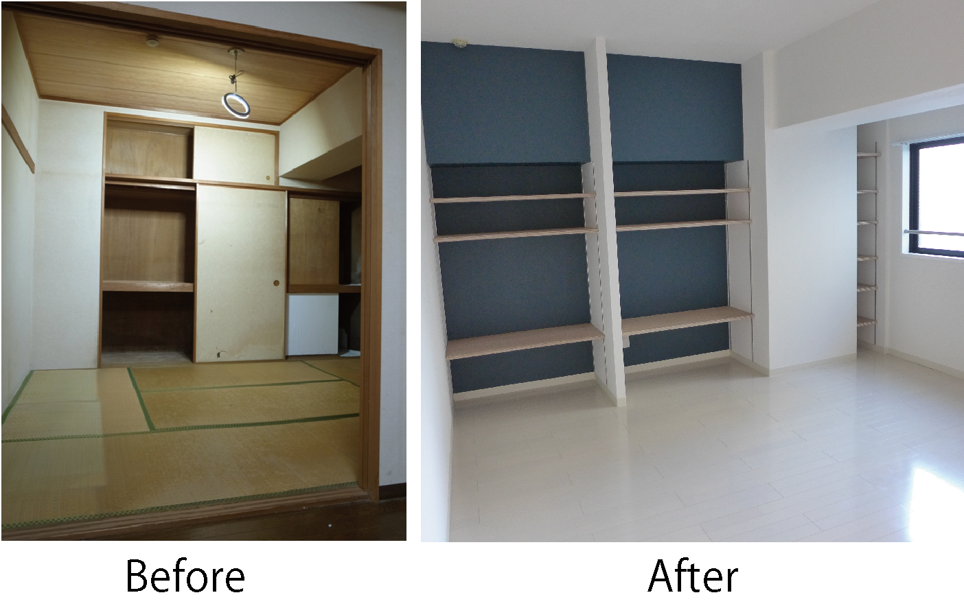 5帖の洋室2部屋よりも収納が大きくゆったりしたご夫婦の寝室として使用できるように2部屋の間仕切り壁を壊し、約7帖の洋室とウォークインクローゼットに再構築。