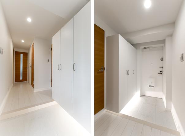 白を基調としています。ポイントとしては、収納を壁に固定し下部にスペースを開け、間接照明を入れました。こうすることで少し広く感じますし、良く使う靴はここに収納することができます。