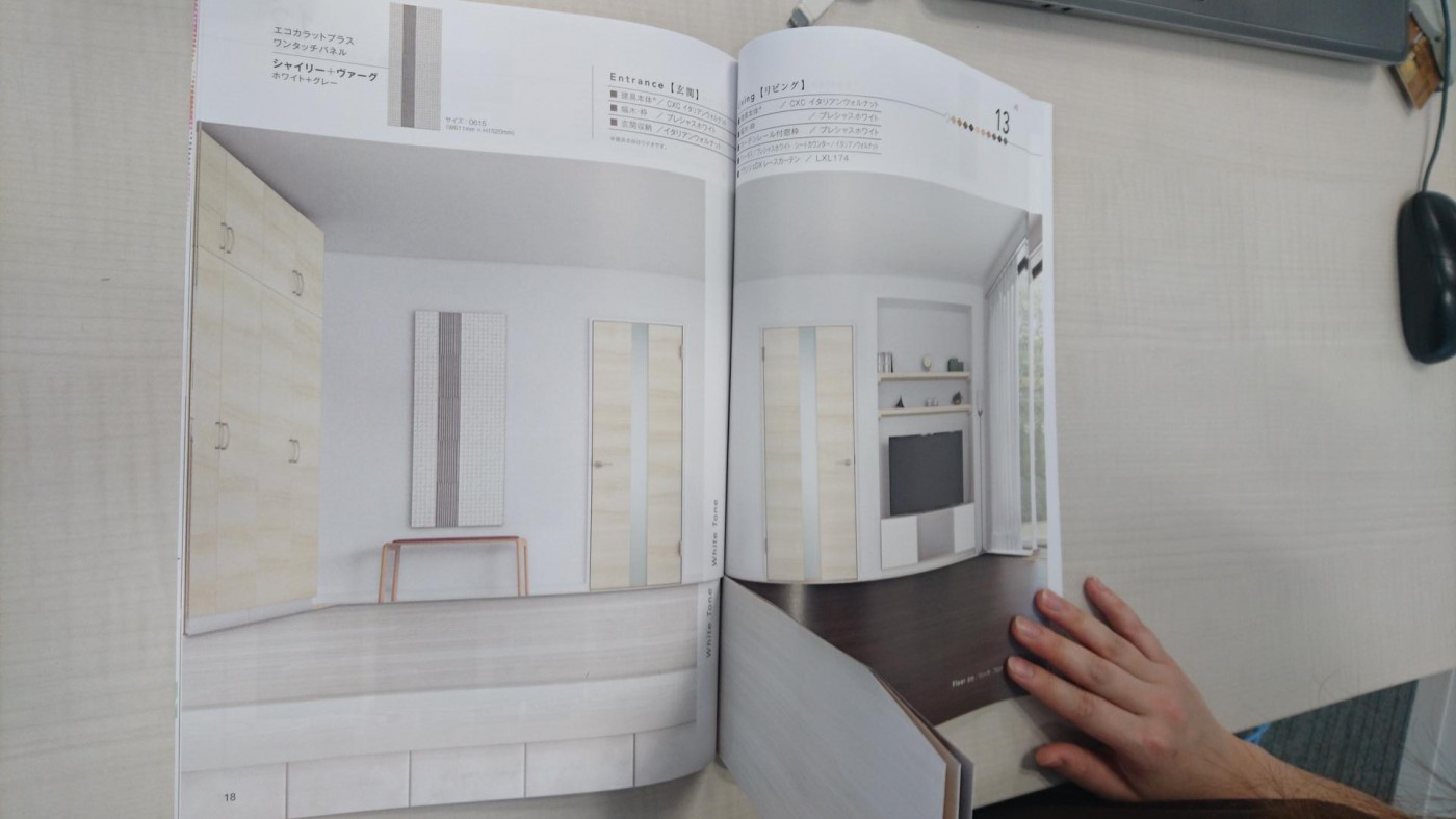一部のメーカーさんではこういった床とドアの色合いのバランスをイメージできるブックなどもありとても便利です。ショールームでもらったり、ホームページで依頼すれば郵送してくれますよ!