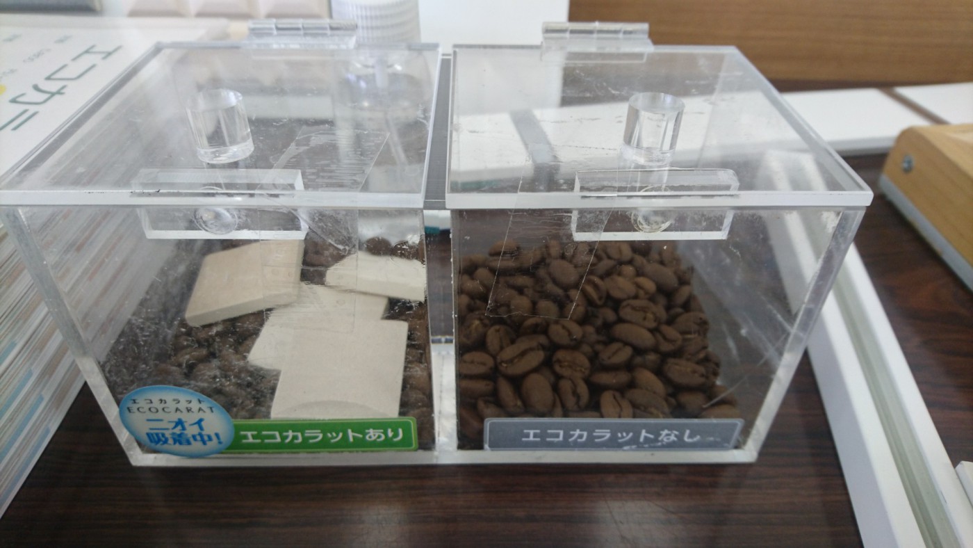 こちらは湿度を調節したり、生活臭を脱臭してくれる「エコカラット」のにおいの実演です。
